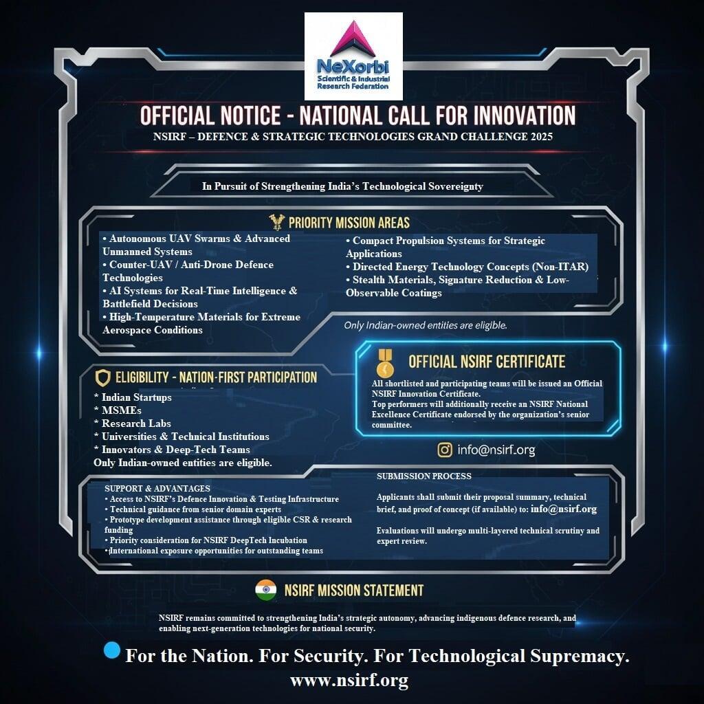 In pursuit of strengthening India’s technological sovereignty and accelerating indigenous capabilities in critical defence domains, NeXorbi Scientific & Industrial Research Federation (NSIRF) issues a national call for breakthrough innovations under the Defence & Strategic Technologies #GrandChallenge2025.